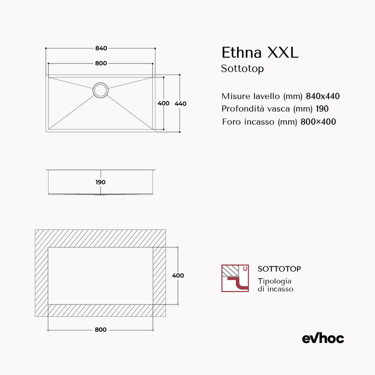 Nella versione XXL questo lavello sottotop misura 84x44 cm, ideale per essere inserito in una base cucina da 90cm. È progettato per garantire ampio spazio e comodità durante le operazioni di lavaggio.