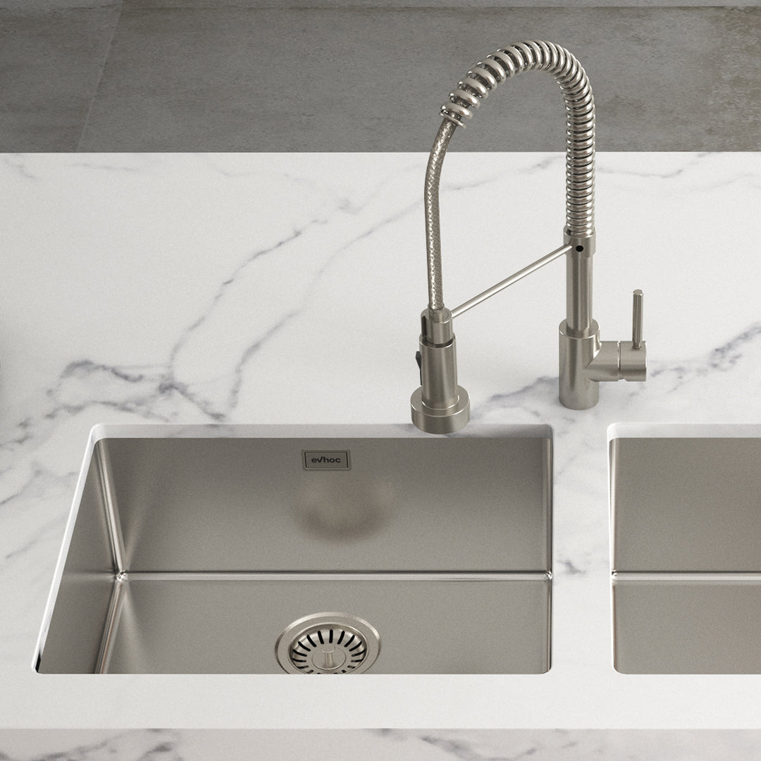 It is a stainless steel sink with a satin Scotch-Brite finish, designed to be paired stylishly with any type of kitchen countertop.