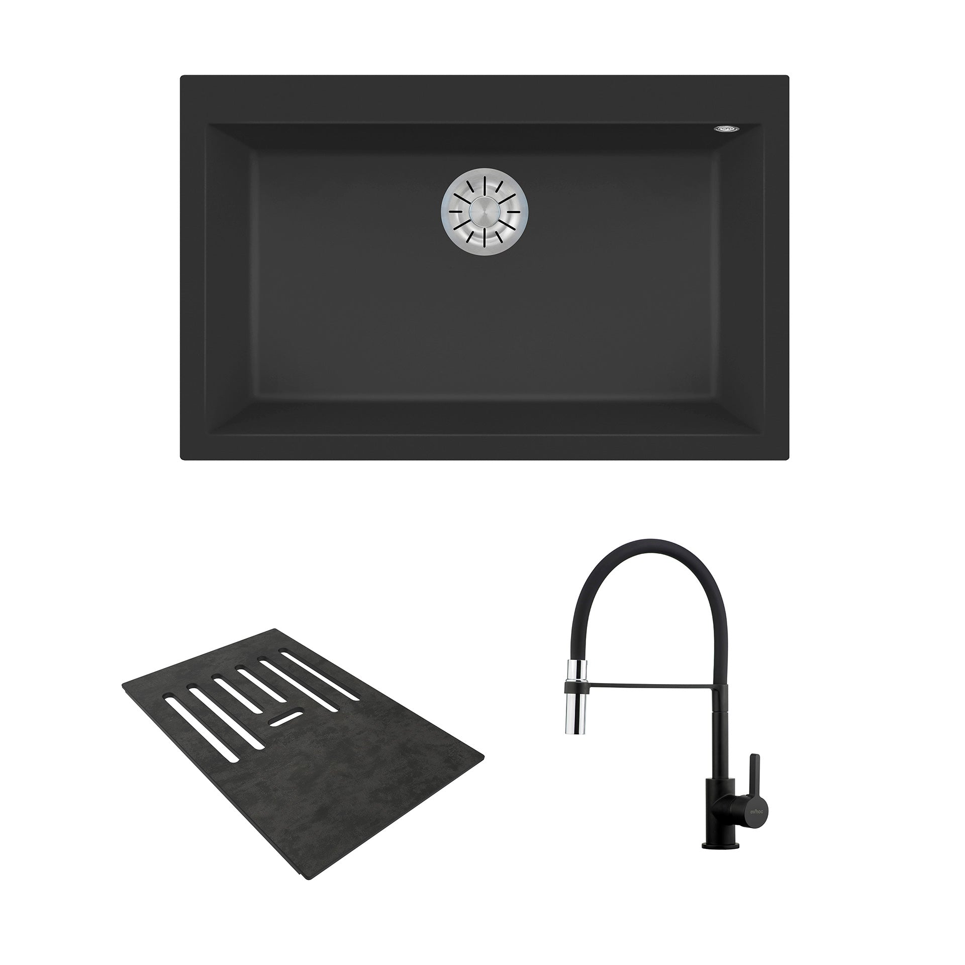 The Gioia set includes Unicum L Inset Black sink, Complement 280 Petra cutting board, and Black Tahlia mixer: it’s a perfect blend of elegance and style.