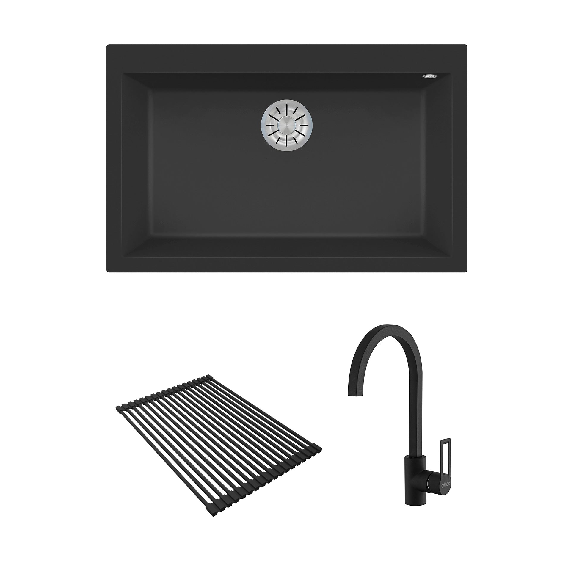 The Fresco set with Unicum L Inset Black sink, Rolling Grate S grid, and Black Venus mixer is the perfect solution for a modern and elegant kitchen.