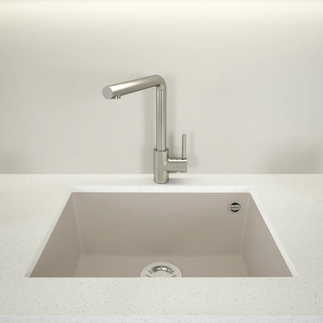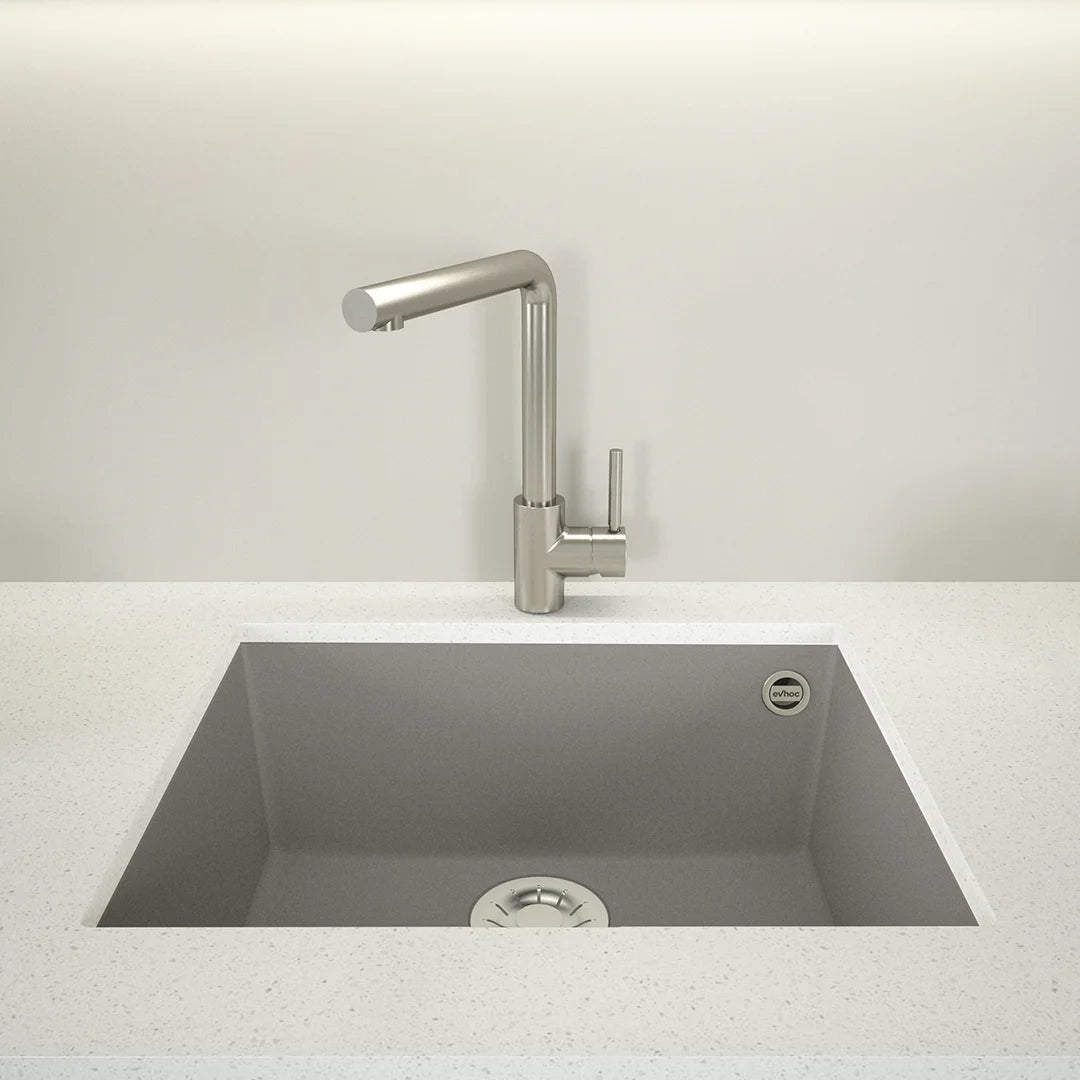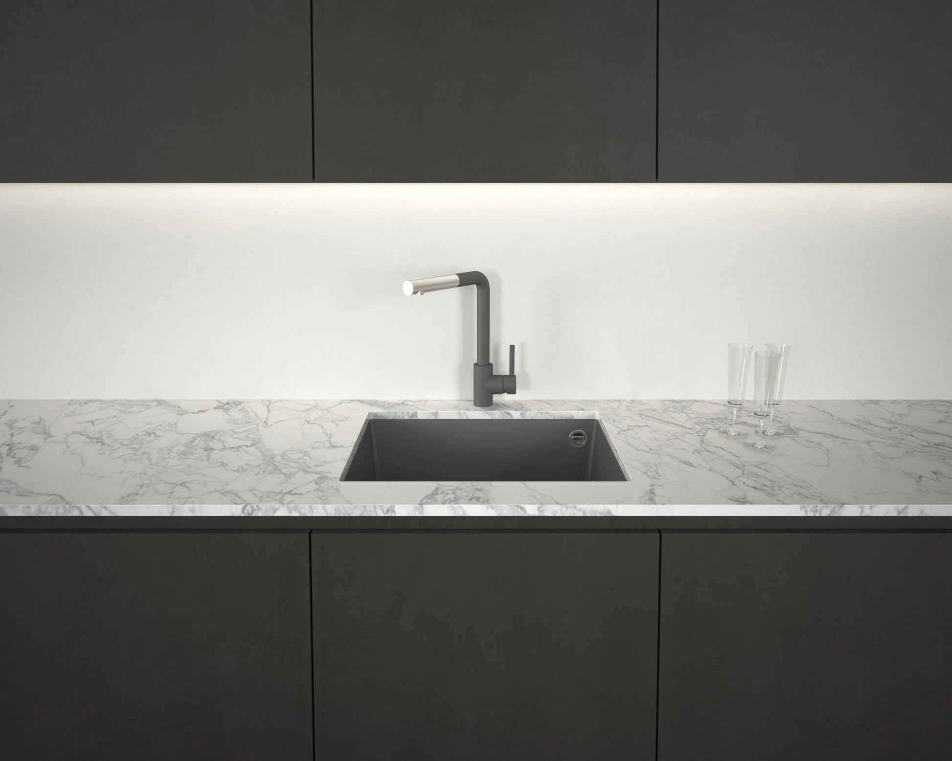 The basin features a wide and deep bottom,with a height of 20 cmand a unique slope ensuring efficient drainage. The internal corners are expertly chamfered with a 5mm radius, eliminating sharp edges and facilitating daily cleaning. Personalize your Unicum S undermount with the variety of captivating colors available: black, cement gray, white, and taupe. This sink not onlyadds timeless style to your kitchenbut also seamlessly integrates with smaller spaces.